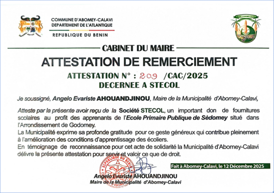 贝宁科托努市政道路项目收到阿波美卡拉维市政府感谢信 |